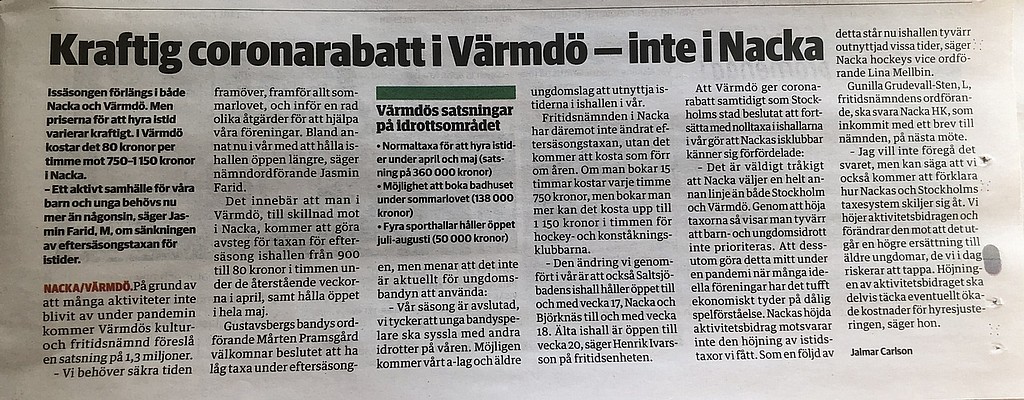 Du som är pluskund hos NVP hittar även artikeln här: https://www.nvp.se/Sport/kraftig-coronarabatt-i-varmdo--inte-i-nacka