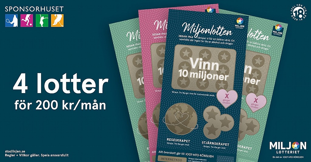 Du har nu möjlighet att köpa 4 st skraplotter från Miljonlotteriet och ha chans att vinna miljoner. Det fantastiska är att du betalar 200 kr för dessa fyra lotter och hela summan tillfaller Nacka HK. Vi hoppas nu att alla testar på detta fantastiska erbjudande. Väljer du sedan att fortsätta prenumerationen så går 25 kr till Nacka HK varje ny månad. OBS! Man kan endast köpa lotterna en gång per person. Klicka här: https://www.miljonlotteriet.se/spela/kampanjer2021/sponsorhuset-hockey?lag=61