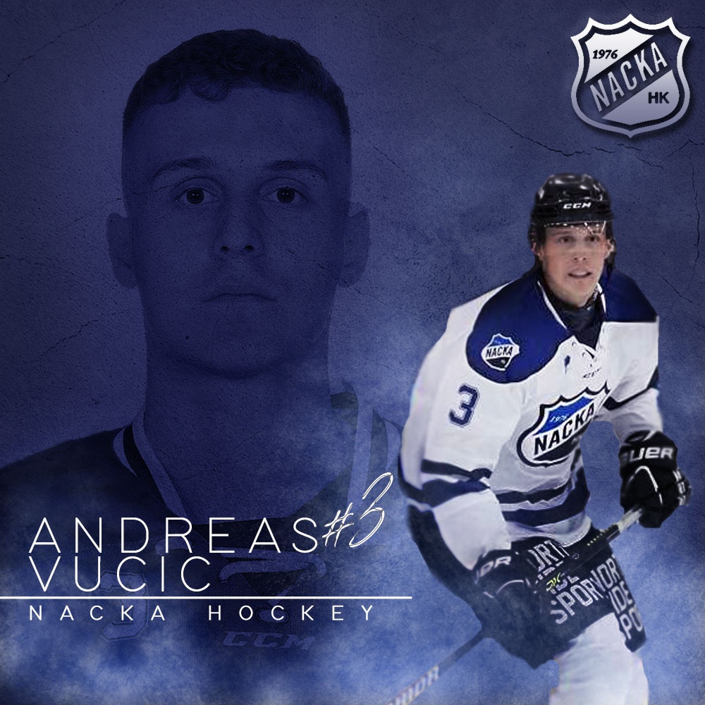 Med en längd på dryga 190 centimeter och en vikt över 90 kg har vi säkrat en stabil backplats i form av Andreas Vucic! Efter två år i Nackas J20 lag tog han klivet upp i A-laget och har därefter visat att hård vilja och gedigen träning ger resultat. Vi har sett honom briljera inom padelspel, i gymmet och på skottrampen så detta år blir året att få utlopp för all talang även på isen. Med sitt slagskott slungandes likt en katapult har han många gånger visat att han kommer bli ett ständigt hot med sitt högerskytte från blålinjen. I den defensiva zonen är det inte helt lätt att ta sig förbi denna bjässe och med ett bra första pass har vi goda förhoppningar att Vucic kommer ta stora kliv denna säsong!